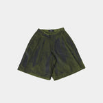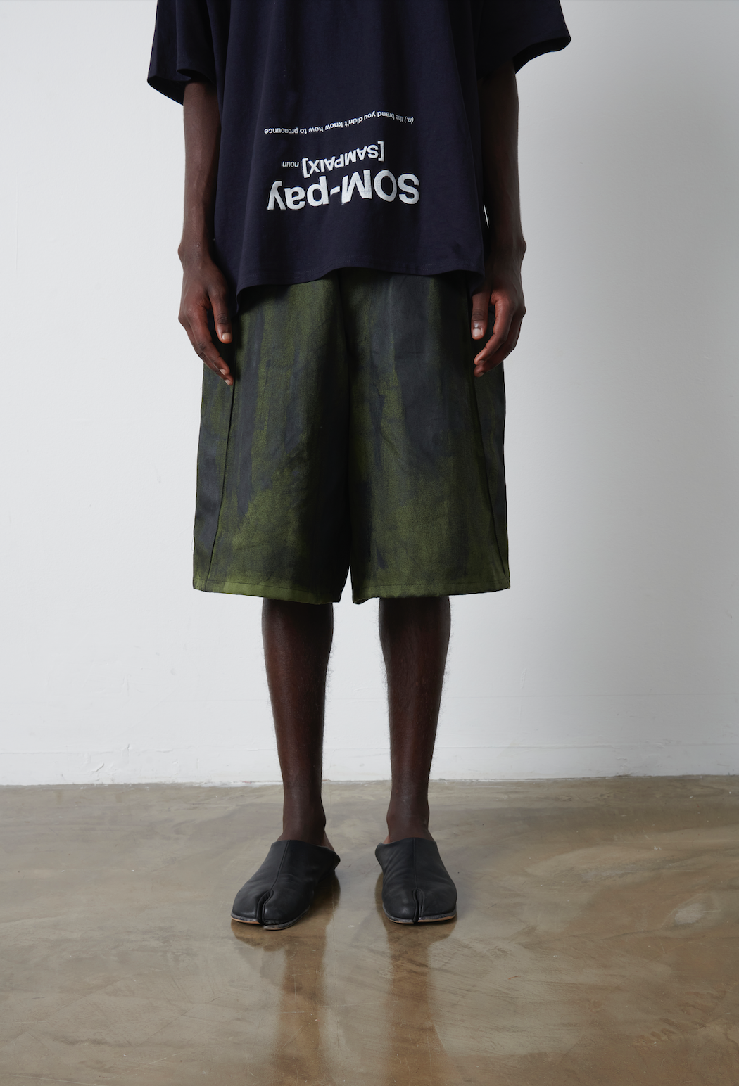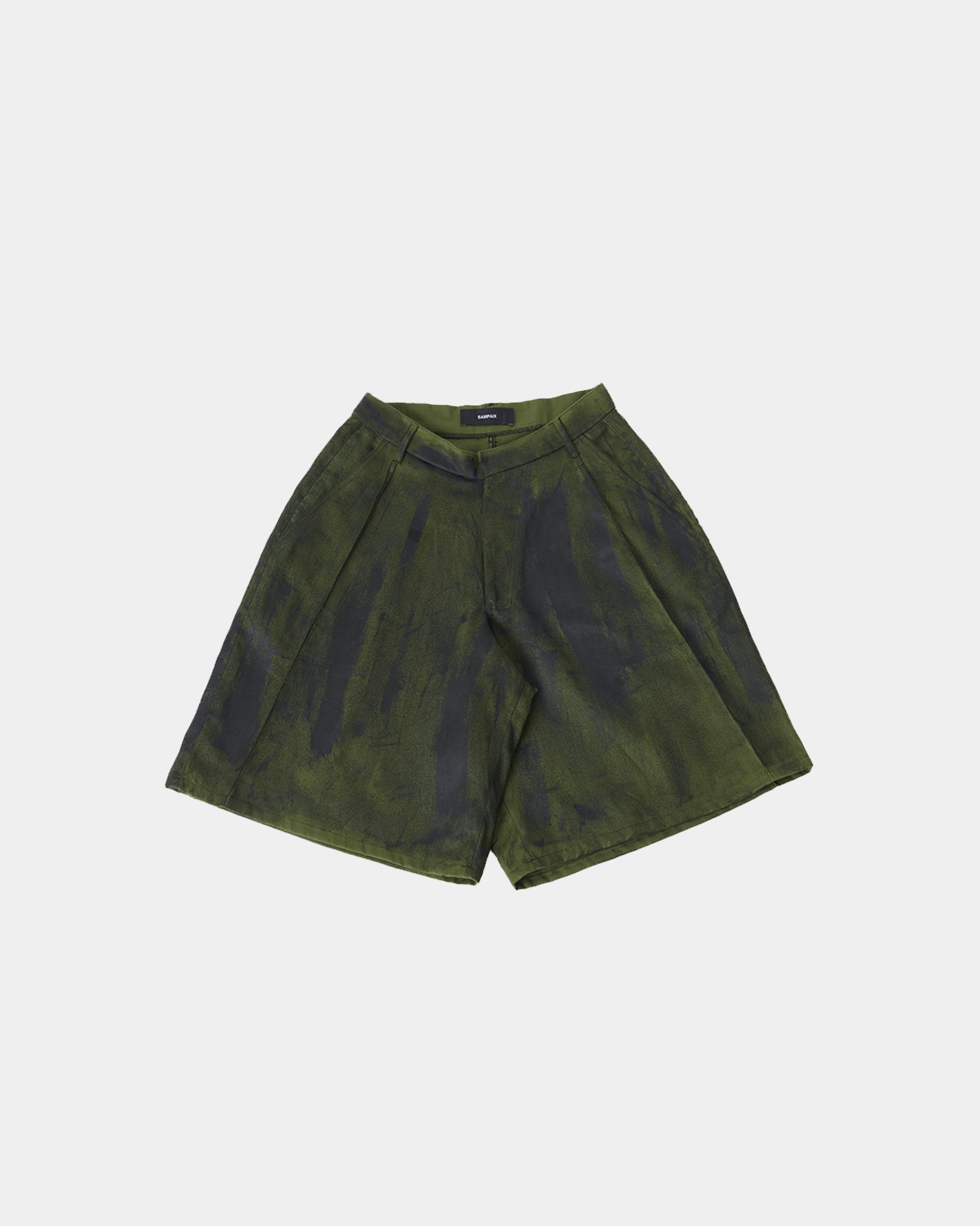 Wide-leg mid-rise pleated shorts with 2 pintucks front and back creating a boxy A-line silhouette.