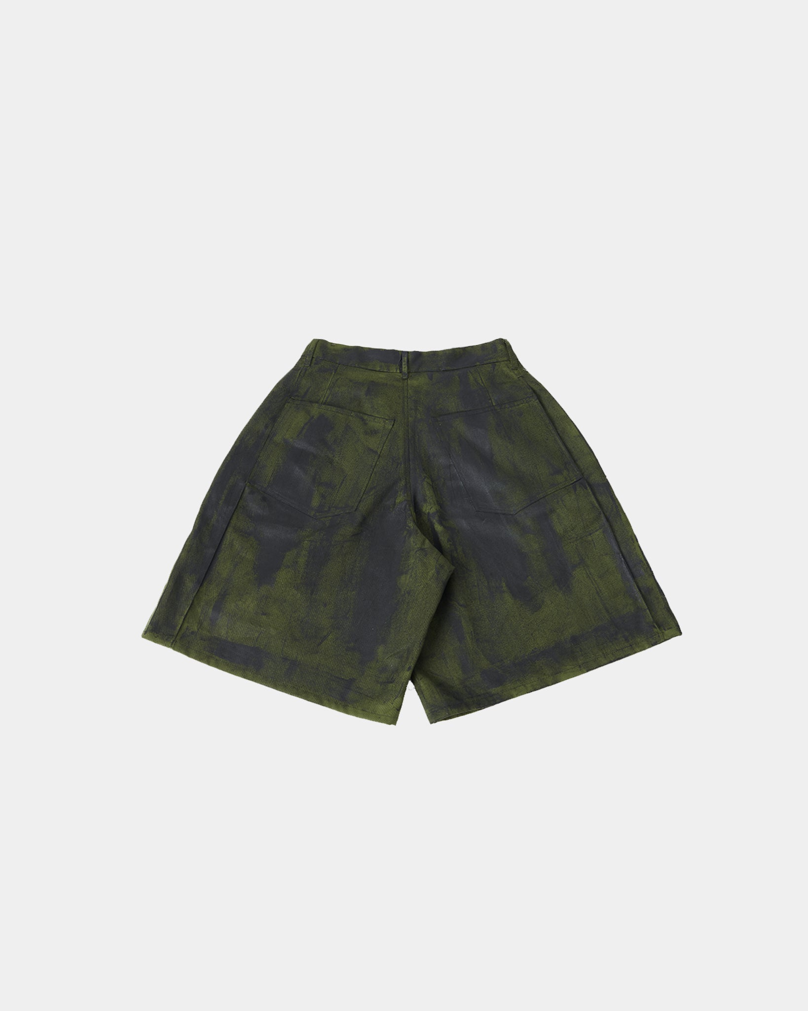 Cotton twill A-line shorts coated with our signature black wax treatment.